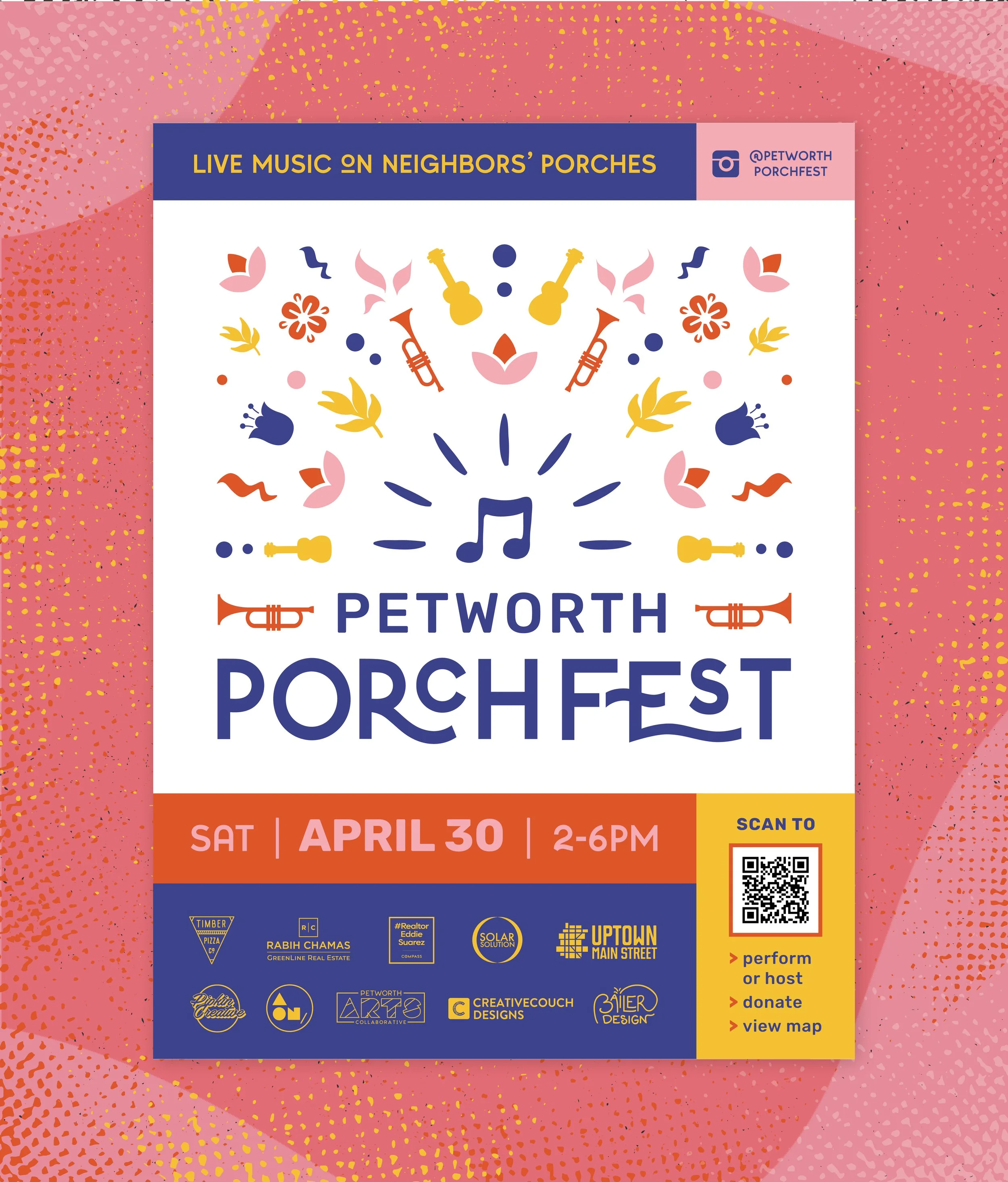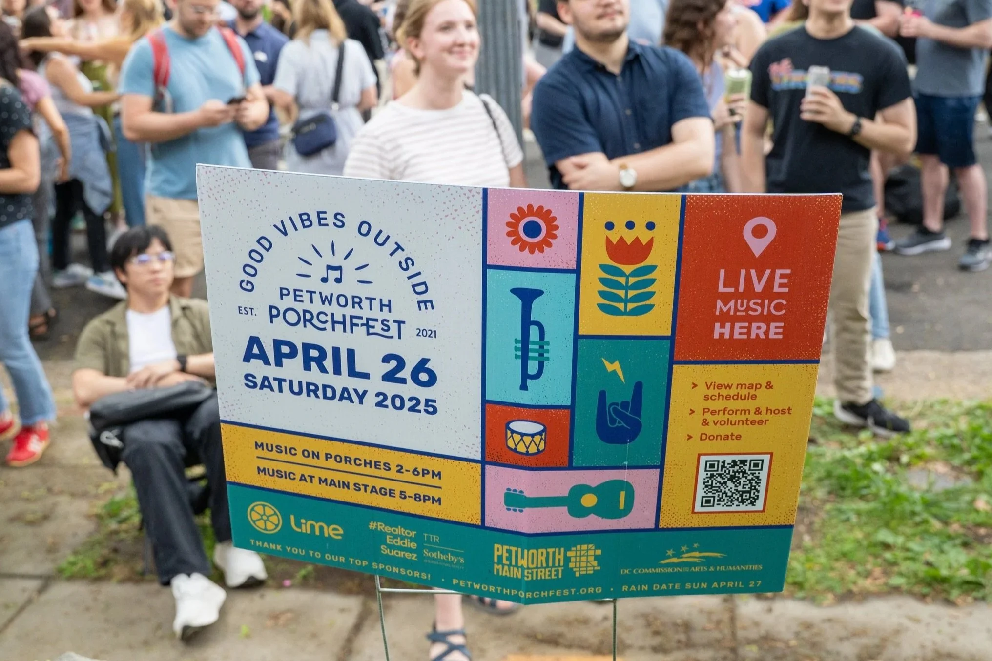 Petworth Porchfest is committed to reaching a diverse audience. With that in mind we created social media ads to capture an online audience, as well as printed materials (posters, cards, fliers and yard signs) for people in our community who might not have easy access to online platforms.